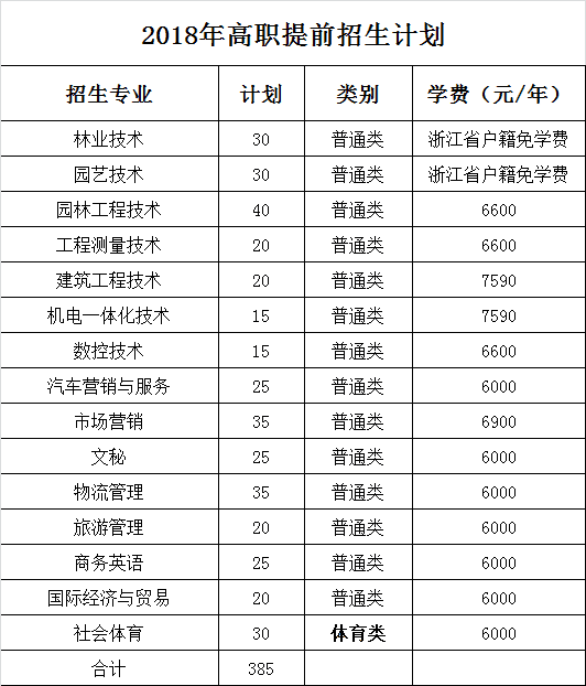 第五条 学校2018年高职提前招生总计划385名,具体招生的专业、计划、类别、学费如下表所示:
